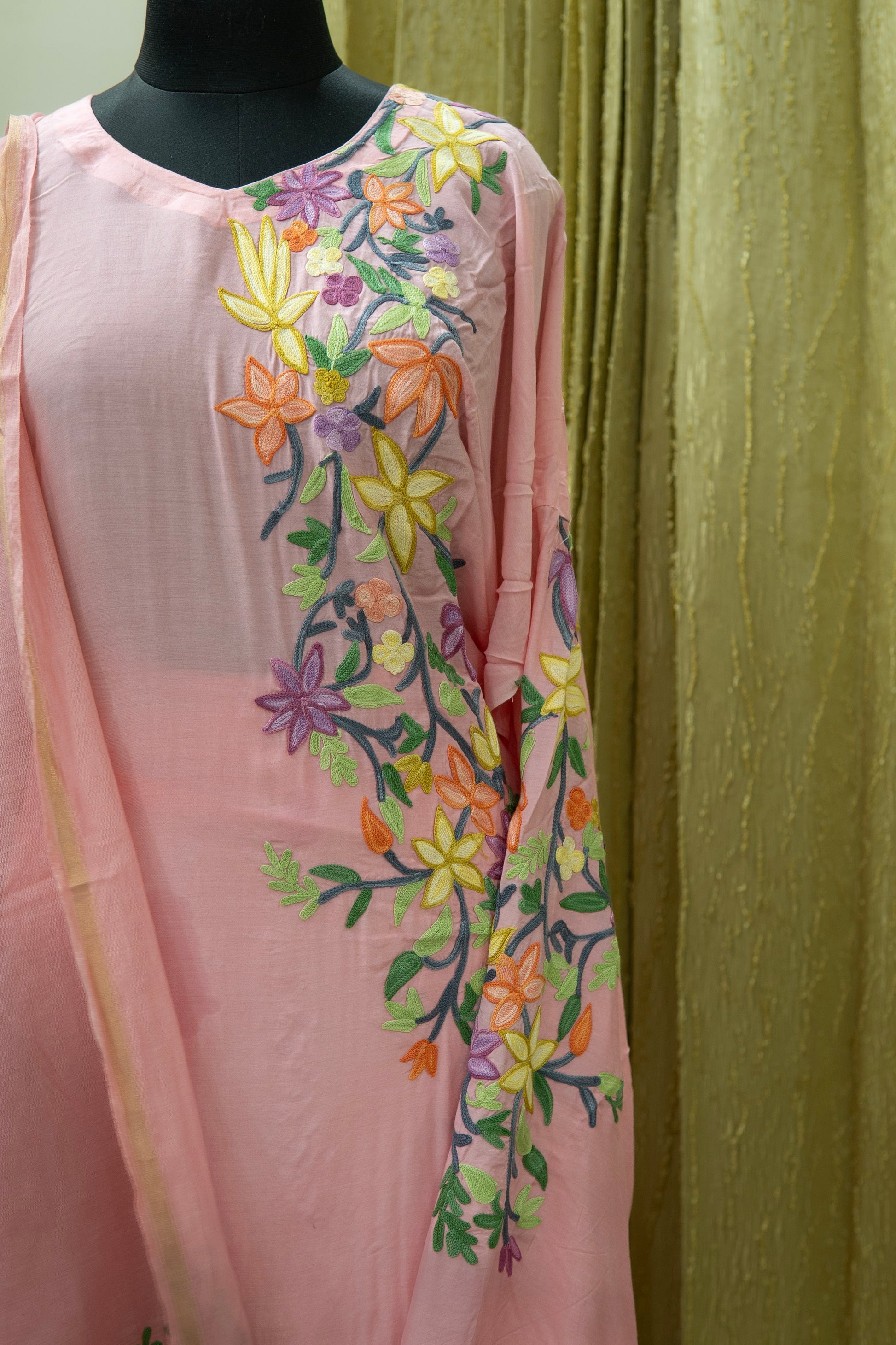 Aarohi is a soft peach-pink color, unstitched suit in cotton, highlighted with multicolor floral embroidery that brings freshness and charm to your ethnic wear collection. Feminine, graceful, and perfect for all seasons.