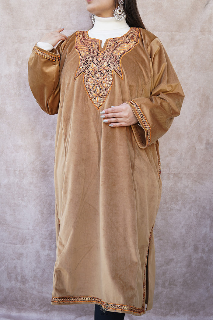Brown Velvet Phiran with Puff Tilla Embroidery