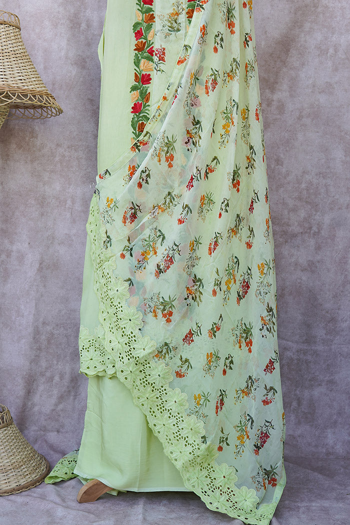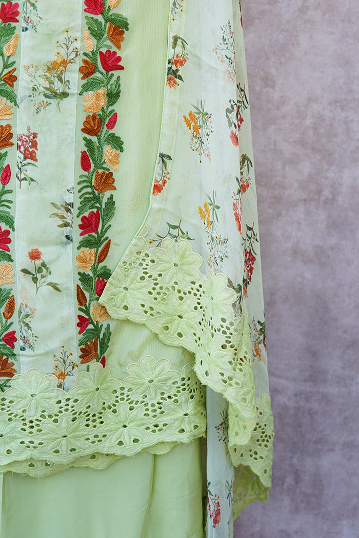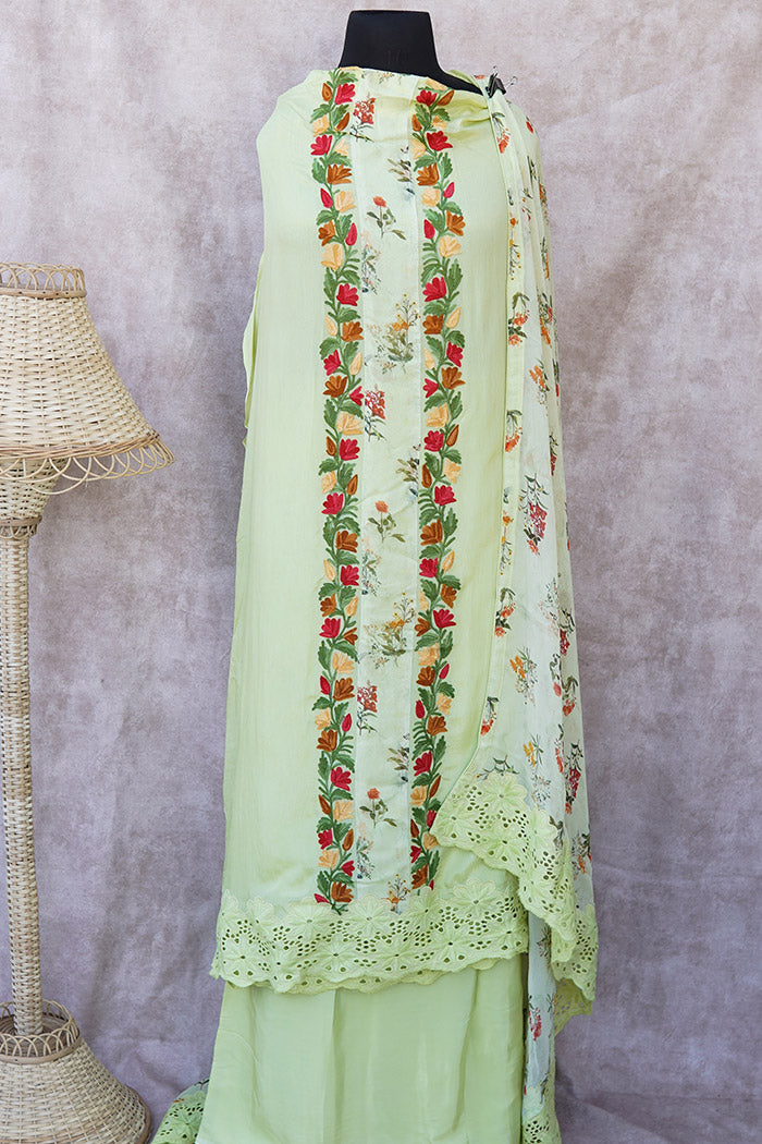 This beautiful piece straight out of our warehouse is a dream addition to your wardrobe. Layered in hues of GREEN, this Suit can be used for both festive and casual occasions where all you want is to make a statement. Rooted in rich Kashmiri tradition, the piece is made of GEORGETTE, which makes it easy to carry. It looks best when paired with ethnic Indian jewelry.