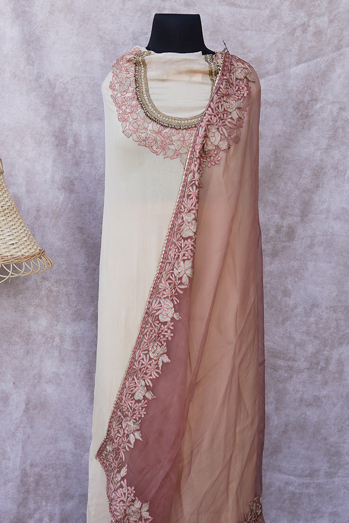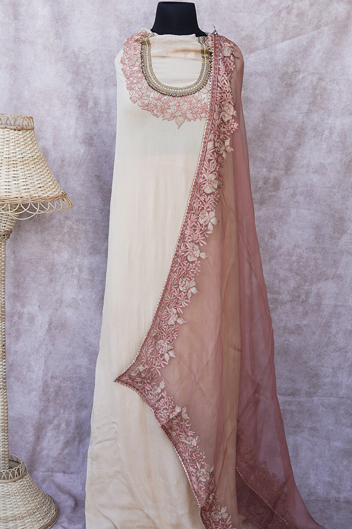This beautiful piece straight out of our warehouse is a dream addition to your wardrobe. Layered in hues of BEIGE, this Suit can be used for both festive and casual occasions where all you want is to make a statement. Rooted in rich Kashmiri tradition, the piece is made of GEORGETTE, which makes it easy to carry. It looks best when paired with ethnic Indian jewelry.