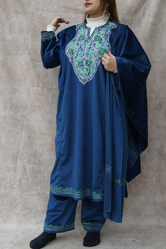 Kashmiri Velvet Blue Phiran Set | Phiran with Stole & Bottom