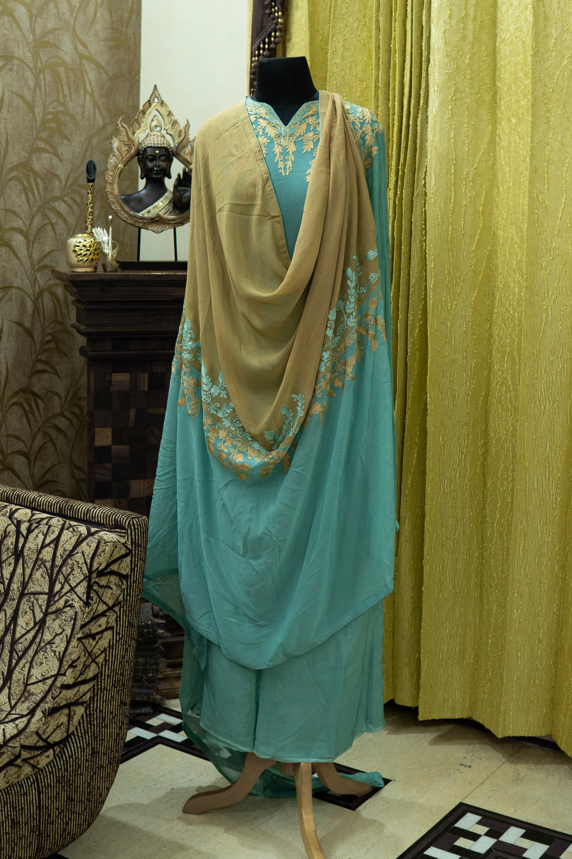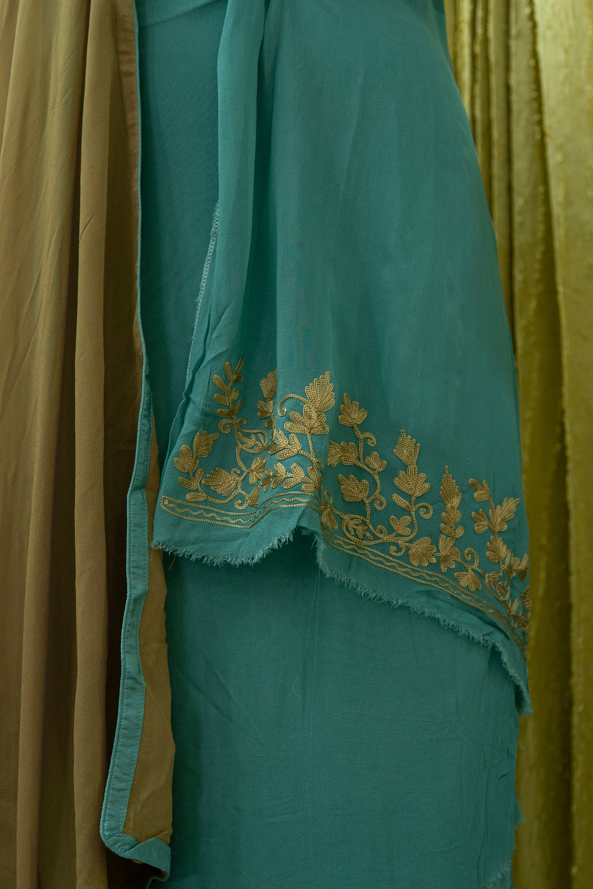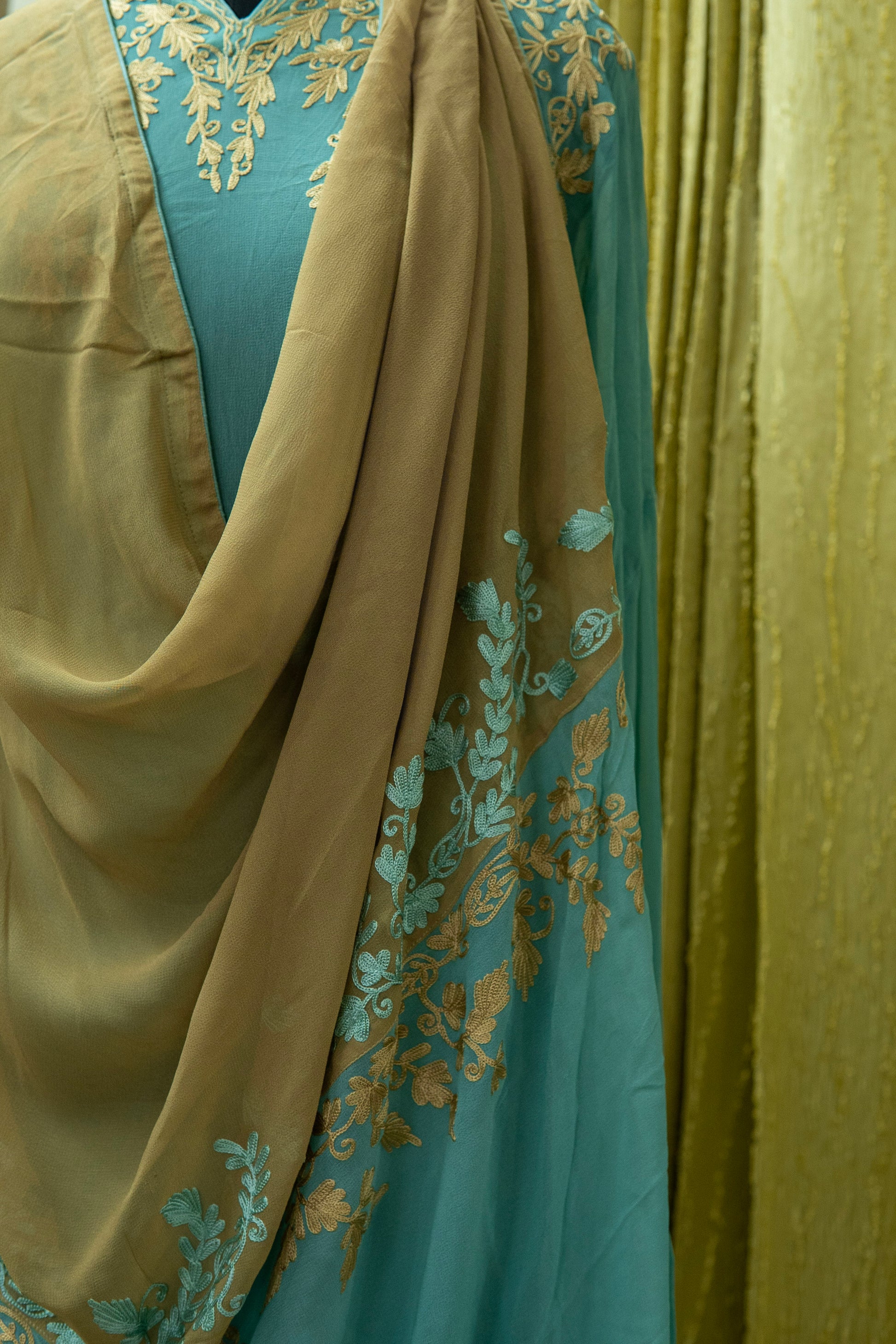 Naaz brings effortless elegance with its teal-blue base in georgette enhanced by beige embroidery. A chic yet traditional pick for every season.