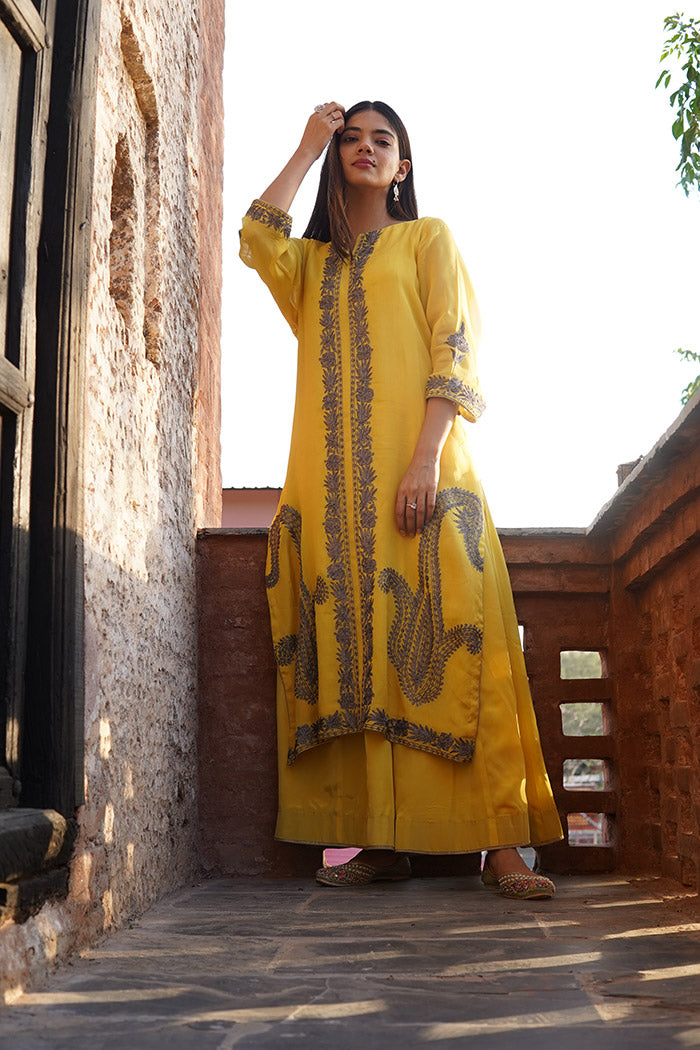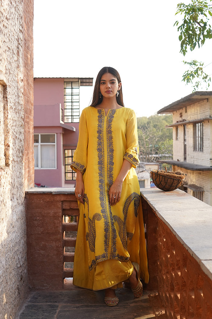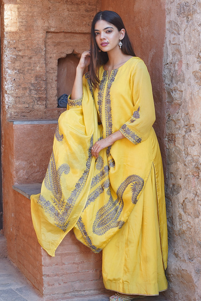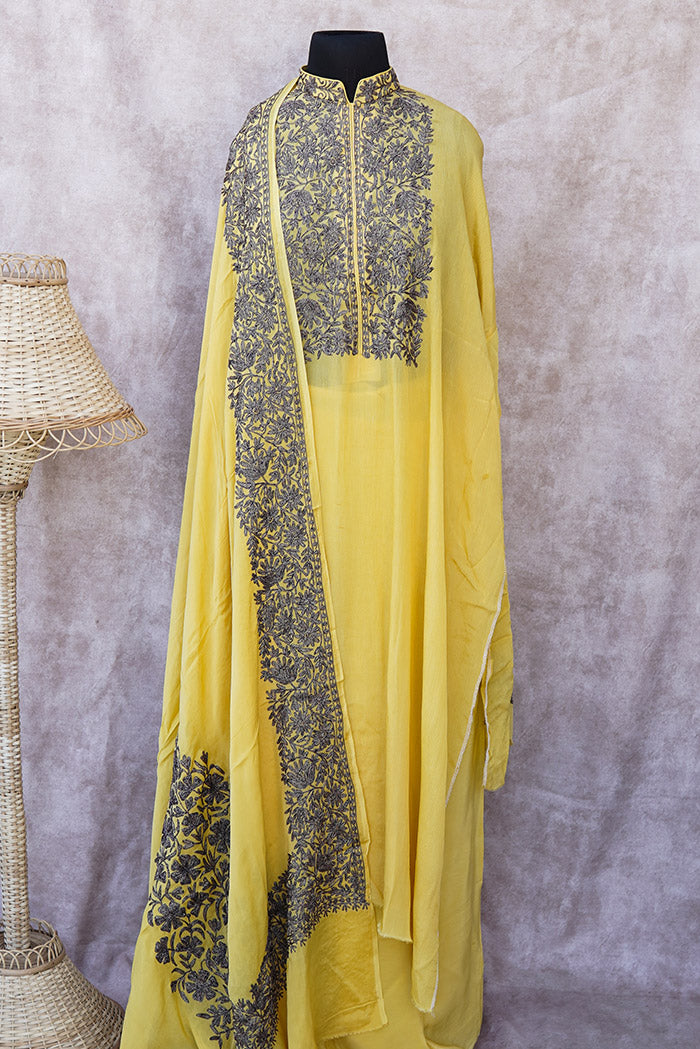 This beautiful piece straight out of our warehouse is a dream addition to your wardrobe. Layered in hues of YELLOW, this gorgeous Suit can be used for both festive and casual occasions where all you want is to make a statement. Rooted in rich Kashmiri tradition, the piece is made of georgette, which makes it easy to carry. It looks best when paired with ethnic Indian jewelry.