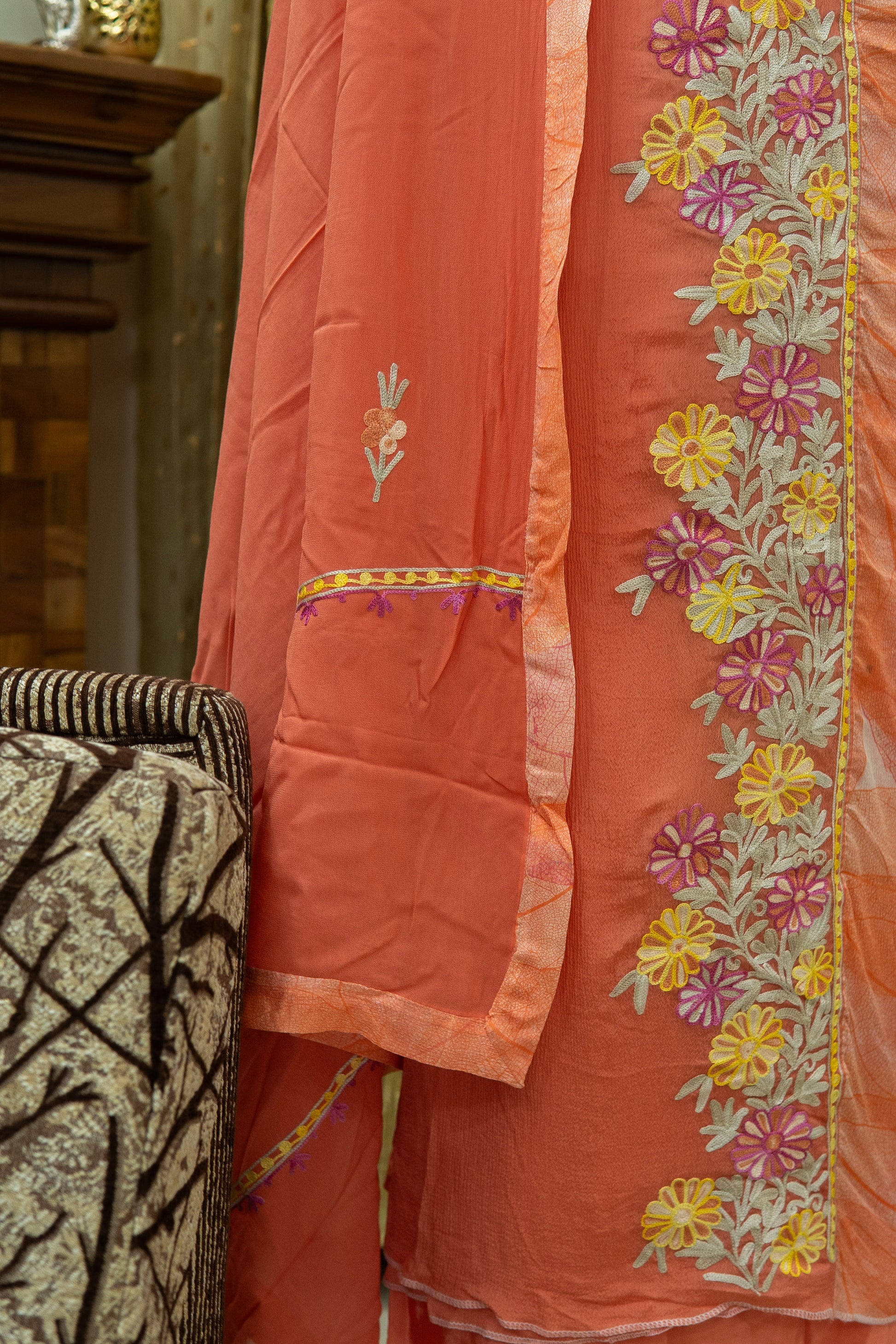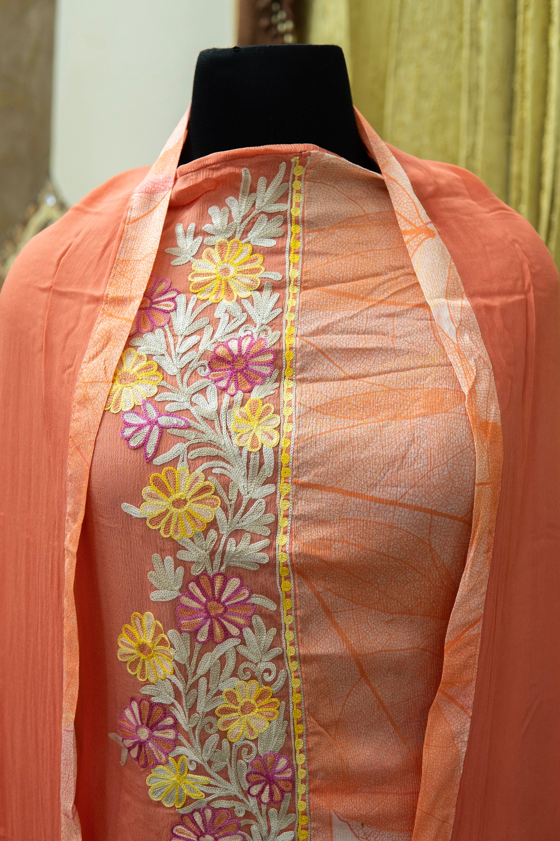 Vaani radiates warmth in a coral-peach shade crafted in Chinon shirt with Georgette Dupatta, beautifully detailed with vertical floral embroidery and print for a flattering look. It’s vibrant, festive, and timeless.